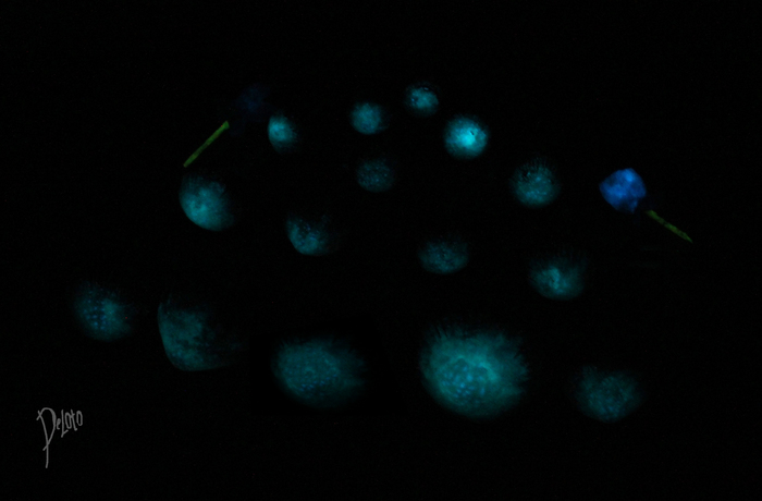 Бутылка с лиловым копринусом и светящимися сыроежками.