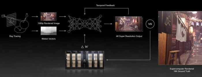 Для каждой игры создается собственный алгоритм восстановления деталей. Это делается посредством ее запуска на серверах компании NVIDIA. Сначала в разрешении 16К рендерится множество кадров из разных сцен. Затем разрешение выбранных кадров понижается до 4К с помощью избыточной выборки (SSAA). На их основе полученных изображений обучается автономная нейросеть.