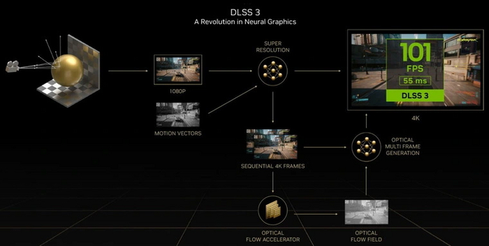 В сентябре 2022 года NVIDIA представила видеокарты серии RTX 4000. А с ними и очередное поколение технологии масштабирования — DLSS 3. Впрочем, называть ее так не совсем корректно. Теперь за повышение производительности отвечает не только масштабирование изображения, но и генерация промежуточных кадров Frame Generation, FG. Конвейер DLSS 3 может работать параллельно с DLSS 2, добавляя к ранее используемым этапам следующие: