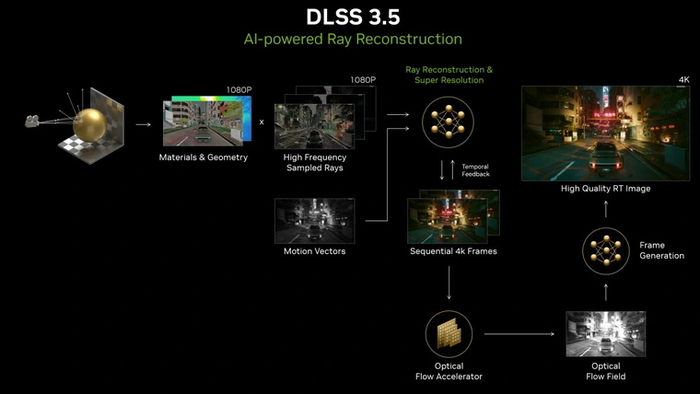 В августе 2023 года NVIDIA представила DLSS 3.5. Это не продолжение классической DLSS, как можно было бы подумать, а скорее дополнение. Ее ключевой фишкой является Ray Reconstruction. Эта технология разработана специально для подавления шумов, возникающих при трассировке лучей. Подобная реконструкция позволяет восстанавливать кадры с трассированными отражениями, тенями и освещением заметно точнее, чем ранее.
