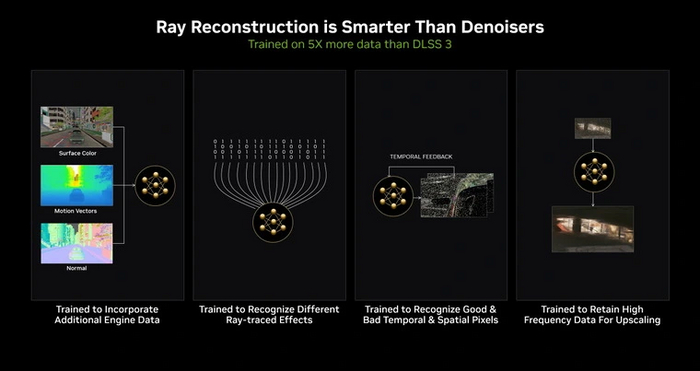 Как заявляет NVIDIA, нейросеть для работы Ray Reconstruction обучалась на впятеро большем объеме данных, чем прошлые версии DLSS. Причем работает она, в отличие от генератора кадров, на всех картах семейства RTX — от 2000 до 4000 серии.