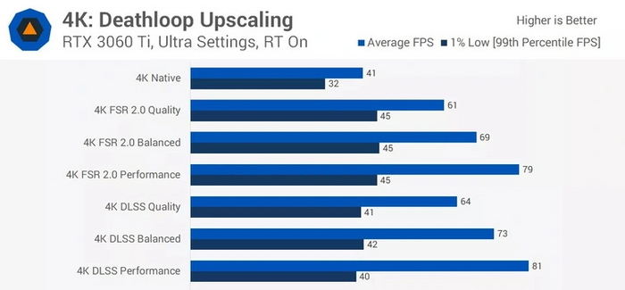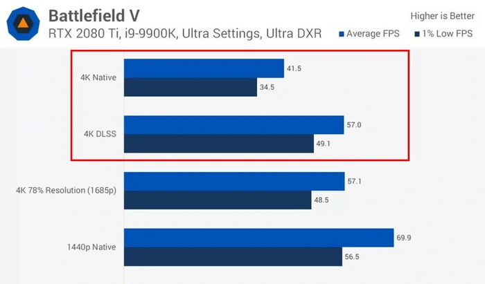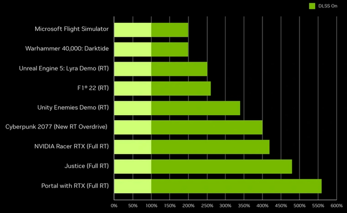У разных поколений технологии прирост производительности отличается. Самая скромная в этом плане — DLSS первой версии, так как разрешение рендеринга у нее фиксированное и довольно высокое. В наиболее «тяжелом» разрешении 4К от нее можно было рассчитывать на 30-40 % дополнительной производительности.
