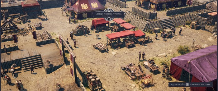 После конца боя вы либо панически отступаете, либо же потрошите вражеский обоз, хватаете пленников и зализываете раны. Вашим новым домом станет по сути база, на которой расквартирован ваш легион. Захватывая области вы получаете доступ к месторождениям ресурсов. Лесопилки, фермы, дубильни и шахты с каменоломнями - все эти места будут снабжать вас необходимым сырьем, с помощью которого вы будете улучшать вашу базу. Улучшение места обитания поможет вам изучить новые тактики боя в мастерской, создавать и улучшать оружие и доспехи в оружейной, отправлять разведчиков на сбор припасов, купить рабов или продукты питания и лекарства на местном рынке, а заодно помогает повысить моральный дух легиона. Последний, а также опыт крайне важны, ведь даже недоукомплектованный легион ветеранов способен наголову и с минимальными потерями разбить неопытную армию с низким моральным духом. Лагерь выглядит, к слову, весьма аутентично и по мере улучшения будет визуально улучшаться, а ваши подчиненные не преминут прокомментировать изменения или же ваши последние действия. В личном шатре игрока можно будет настроить показ трофеев, а также настроить цветовую схему вашей преторианской гвардии и легиона отдельно. Дел добавляется после создания второго легиона, но это уже заход на территорию глубоких спойлеров, а я предпочитаю в играх такого вида их не использовать по возможности