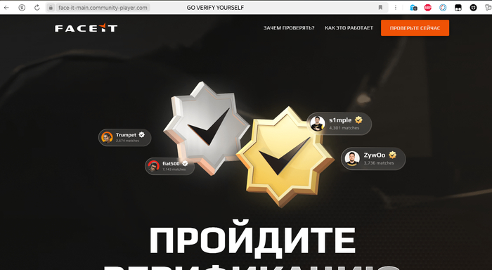 Все выглядело так, будто это часть Faceit. Мне сказали, чтобы запустить матч нужна ВЕРИФИКАЦИЯ) в данном сервере. И мне бот отправляет кнопку "верифицируйтесь", я перехожу, опять безобидный выбор серверов, какие-то вопросы и перенаправляет на этот шедевро-сайт)