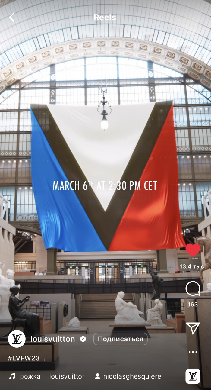 Понятно, что весь ритеил особенно в области высокой моды и баснословно дорогих брендов построен на провокациях и так называемых "перфомансах", но Луи Виттон сегодня резко всех уделал. Анонсируя свое фэшн-шоу с презентацией новой коллекции бренд использовал цвета флага...России, ЛНР, ДНР и кульминацией ролика на весь экран буква "V" и все это в официальном аккаунте инстаграм*.