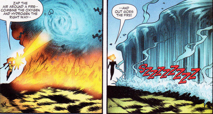 А ещё в этом комиксе запасная история посвящена Файршторму, ядерному человеку. Файршторм офигенно рад – его официально приняли в Лигу Справедливости! Полетав, Файршторм отключает дающую ему силу матрицу и разделяется – на Ронни Рэймонда и профессора Мартина Штейна. Ронни представляется и объясняет профессору, в чём причина его провалов в памяти (поначалу, когда Ронни превращался в Файршторма, профессор Штейн, где бы он ни был, исчезал и превращался в голос у него в голове – а потом, вернувшись в нормальное состояние, ничего не помнил). По сути, эта история – напоминание об ориджине Файршторма. О том, как Ронни Рэймонд примкнул к террористам, чтобы впечатлить девушку, но понял, что воевал не в ту сторону, и пошёл против террористов – и взрыв в лаборатории связал его с немолодым учёным, Мартином Штейном, спрятав в теле Ронни «Матрицу Файршторма». Теперь каждый раз при активации Матрицы Ронни Рэймонд превращается в Файршторма, а профессор Штейн – в голос у него в голове. Так и живём!