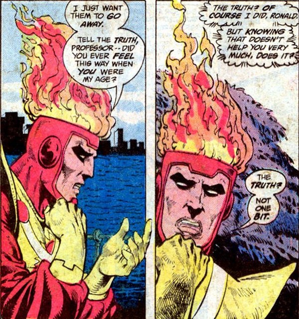 Продолжается и история Файршторма. Ронни Рэймонд объясняет профессору Штейну, почему у того случаются «блэкауты». Мартину Штейну в этот рассказ поверить нелегко, поэтому что он действительно напоминает фантастику. И поскольку профессор не верит ни слову из того, что ему рассказал Ронни, тот решает доказать свои слова на деле – и превращается в Файршторма. Профессор Штейн исчезает – и оказывается заперт в пылающей голове Ядерного Человека. А чтобы Штейн не забыл об этом сразу после «разъединения», Ронни с помощью своих способностей к ядерной трансфигурации превращает немного хлама в сверхскоростной фотоаппарат – и запечатлевает процесс обратного превращения. Так Ронни и Мартин Штейн понимают, что теперь они связаны даже крепче, чем друзья. Теперь они (ну, не круглосуточно, но время от времени) – буквально единое целое.