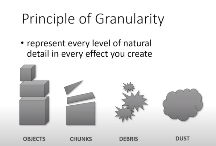 При работе над эффектами Рихтер придерживался принципа «гранулярности»: все детали, которые образуются в процессе «разрушения», — отдельные объекты, их части, обломки и мелкие частицы, — должны были быть отражены визуально. По такому же принципу создают эффекты для кино: если какому-то из этих элементов не уделить достаточно внимания, правдоподобная картинка не сложится.