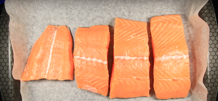 Выкладываем рыбу на противень. Смазываем оливковым маслом, солим, перчим.