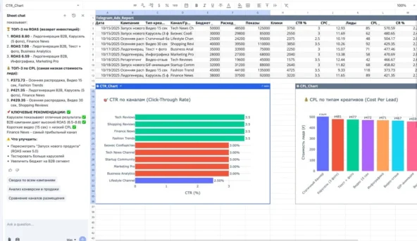 ChatGPT — помогает придумывать формулы, анализировать данные таблиц и собирать понятные отчеты прямо из чата.