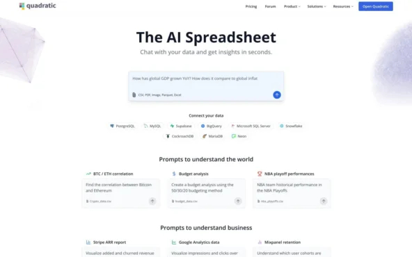 Поддерживает загрузку собственных датасетов (XLSX, CSV, SQL, JSON) и работу с ними прямо в чате.