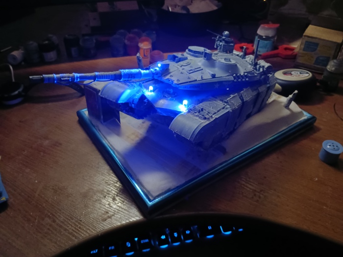прилепил эпоксидкой ходовую,запихал батарейки и соединил проводки с башней.башню на клей не стал сажать,тк там батарейки менять и подвинуть можно,если мешать что то будет.готово,принимайте работу в части два