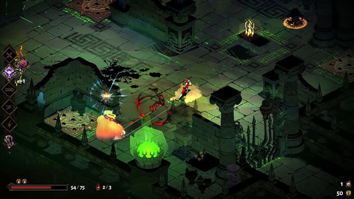Ладно, давайте к тому, что из себя игра представляет, а то вступление затянулось. Hades рассказывает историю о сыне Аида, Загрее, который пытается сбежать из Подземного Царства, где вырос. Дело не только в том, что ему здесь не нравится — и дальше уже лёгкие спойлеры, так сказать, привыкайте. Загрей надеется найти на поверхности свою родную мать. Однако отец сильно против… Бывает. Да и само царство Аида построено так, чтобы из него было невозможно сбежать. К счастью, на стороне Загрея два момента. Первый — он всё же бог. Его невозможно убить насовсем, так что если вдруг шальное копьё всё же окончит его побег — он лишь вновь окажется в Доме Аида. Откуда снова отправится в путь.