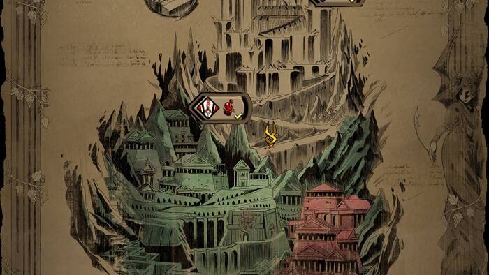 Также в каждом регионе нас ждёт один босс и один персонаж греческих мифов. Как правило, с каждым из них у нас складываются свои отношения, с ними происходят полноценные диалоги. Ну то есть как… Эм, минуту. Сейчас мы до этого дойдём.