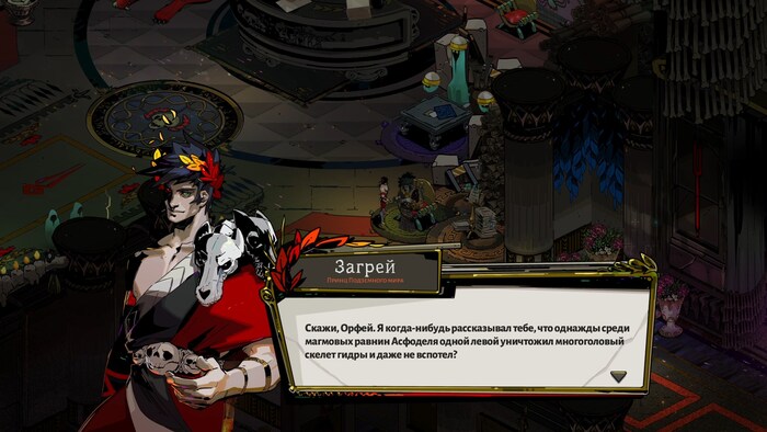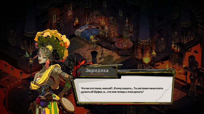 Собственно, это другой аспект проблемы — у нас абсолютно нет контроля над развитием сюжета и подсюжетов. В игре есть свои романтические линии, свои побочные сюжеты, например, про Орфея и Эвридику. Это не является спойлером, игра Supergiant, известных потрясающими саундтреками своих игр, посвящённая греческим мифам о загробном мире, не могла обойтись без этого мифа, как ты ни крути. Так вот, контроля над развитием сюжета у нас нет, и мы вообще не знаем никаких способов продвигать его, кроме как в лоб крутить попытки побега Загрея вновь и вновь, надеясь, что в этот раз либо время пришло, либо какой-то неочевидный триггер сработает, и сюжет продвинется вперёд.