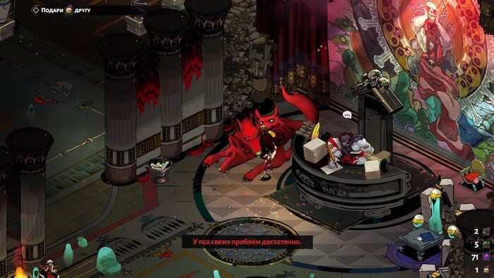 И есть ещё один момент, я не знаю, куда его вставить, поэтому вставлю сюда. Меня абсолютно устраивает то, что в игре нет детальной анимации лиц, или рук, что мы по сути говорим портретами. У каждого персонажа всего два-три портрета с эмоциями, и мы иногда между ними переключаемся. Это — ок. Но вот есть деталь, которая, оглядываясь назад, меня калит. У нас есть интеракция с Цербером — мы его гладить можем. И это санимировано, всё хорошо. Но из-за этого возникают вопросы относительно сюжетных моментов. Будь то романтическая линия Загрея или его встреча с матерью, нам не покажут, как вот эти фигурки обнимутся или ещё как-то взаимодействуют друг с другом. И этого так не хватает! И ни прекрасная озвучка, ни красивые портреты этого не заменят.