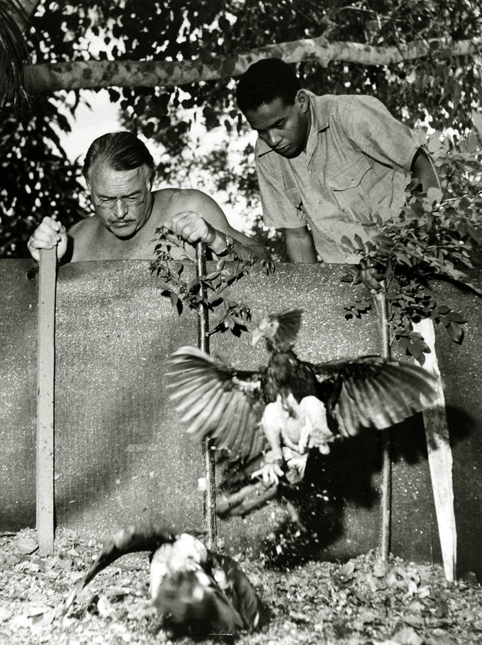 1951. Эрнест Хемингуэй с местным жителем, они оба владеют боевыми петухами-чемпионами, которые зарабатывают для них деньги на местных схватках:
