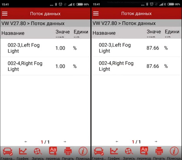 Дальше побаловался проверкой противотуманок. Можно увидеть, как меняются значения в реальном времени, при включении и выключении противотуманок.