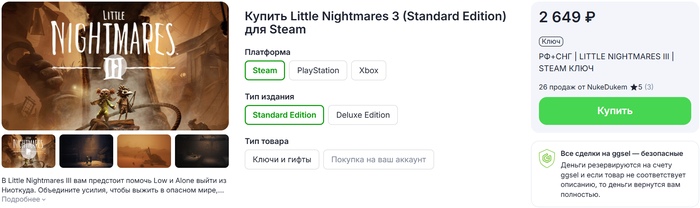 Переходим в категорию «Little Nightmares 3» и выбираем подходящий товар. Также, как и в предыдущем способе, смотрим на его критерии, внимательно читаем описание и оплачиваем.