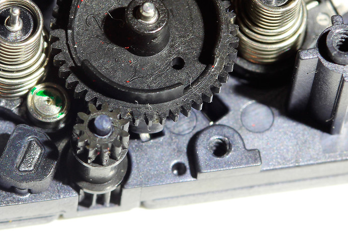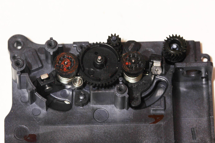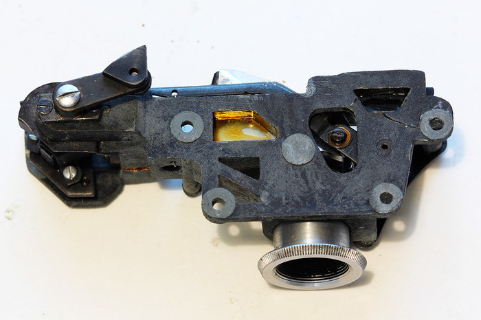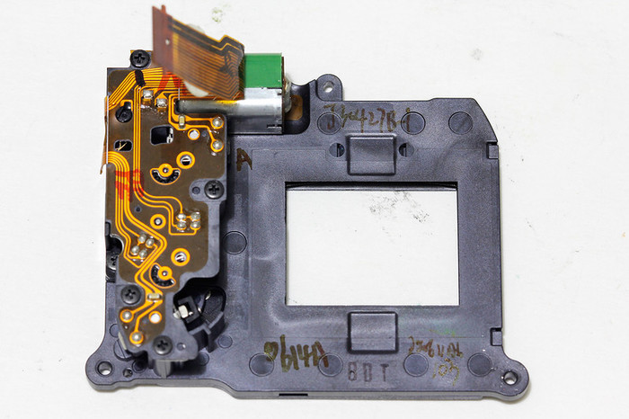 Справа механизм подъема зеркала с демпфером. Это основной источник тупизны механики и того самого дикого визга. Вот эти четыре маленькие шестеренки и надо смазывать. Не удивительно, что народ тупо капает туда масло из шприца. Разборка камеры для полноценного ремонта довольно трудоемка и занимает много времени.