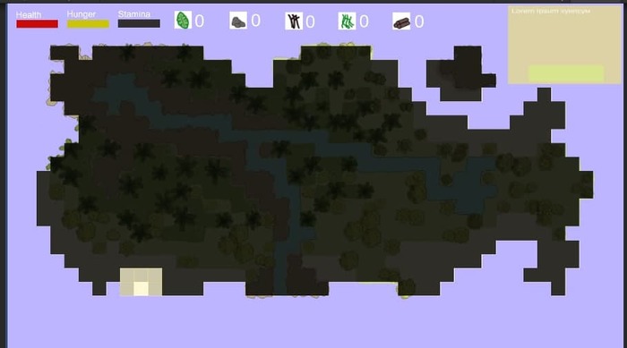 Обсудив разные механики от tower defence до раннера, мы решили, что довольно интересной и необычной идеей было бы сделать исследование острова, состоящего из тайлов со случайными событиями и действиями. Этакий выживач с целью собрать ресурсы, чтобы смастерить плот и уплыть с острова. Идея показалась очень простой и с точки зрения добавления контента — текстовые события и действия; и с точки зрения разработки — грид с тайлсетом и всего одним типом взаимодействия, да к тому же, всё действие происходит на одном экране.
