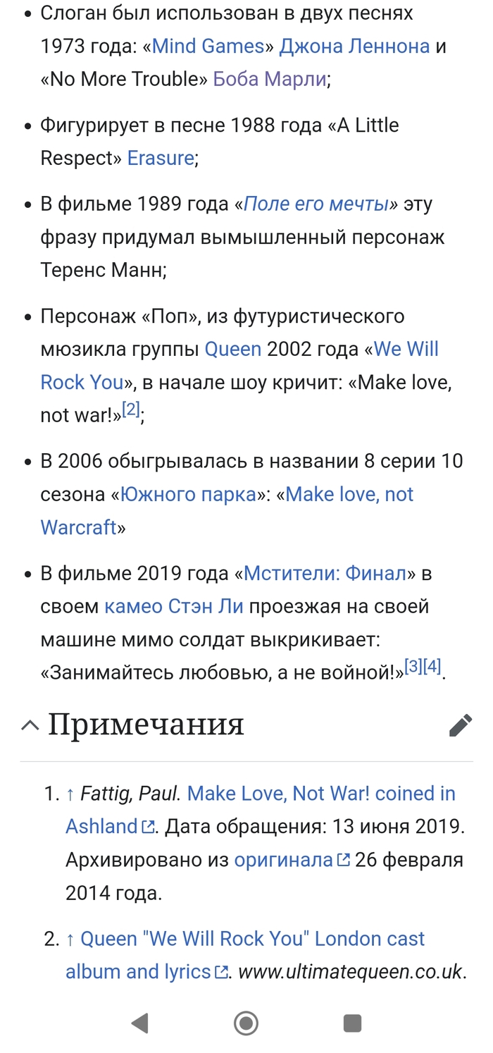 Персонаж «Поп», из футуристического мюзикла группы Queen 2002 года «We Will Rock You», в начале шоу кричит: «Make love, not war!»[8];