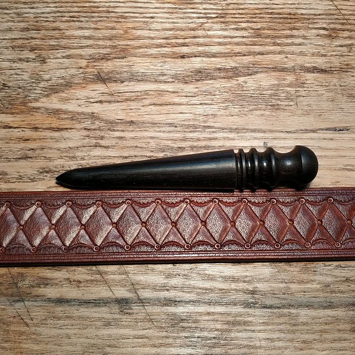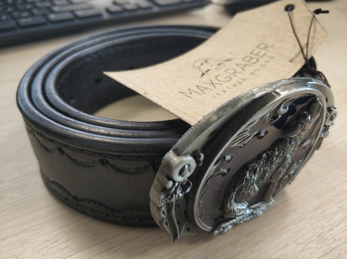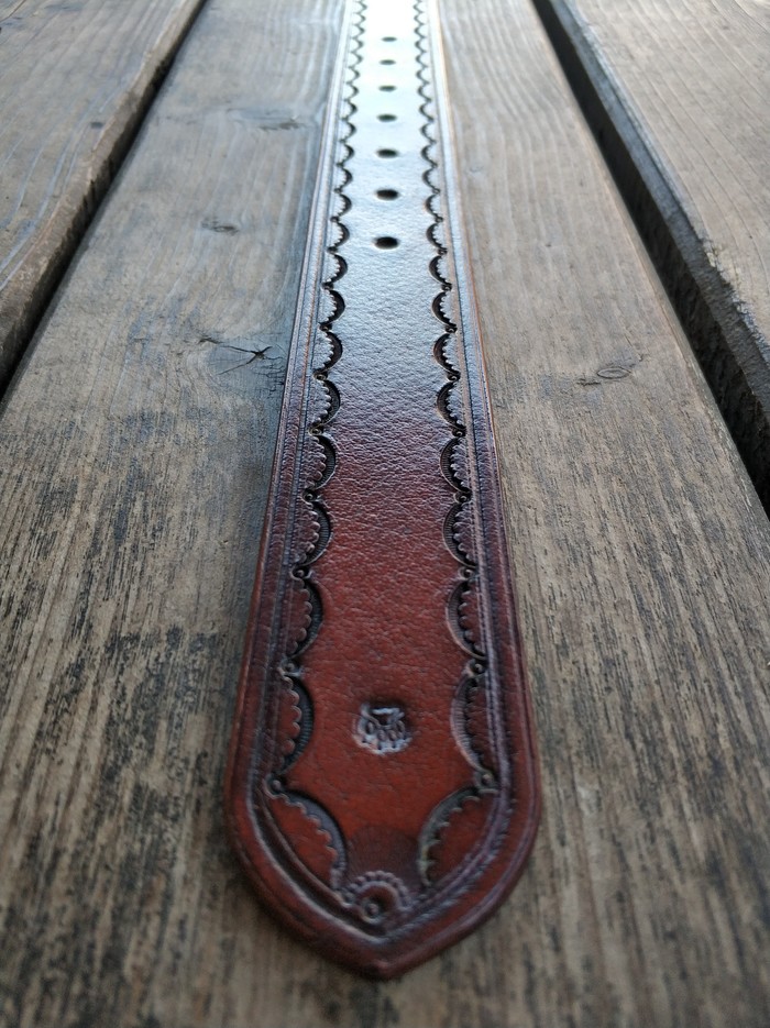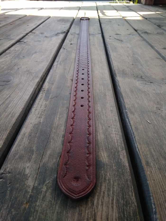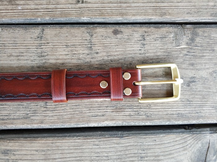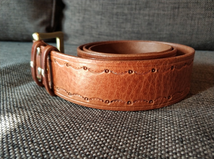 Небольшое тиснение для подчеркивания фактуры в центре и украшения изделия, краешки (урезы) под сликер, да фурнитуру. Ап и тут я понял, что взял болты только на один комплект, а ремней сделал два. Ну где наша не пропадала? Нашел в сарае старый ремень с одним винтом - поставил по центру, а пряжку зафиксировал седельным швом - размер-то уже выверен и допуск есть по паре отверстий. Вышло не плохо, я думаю, но сфоткать второй не успел.