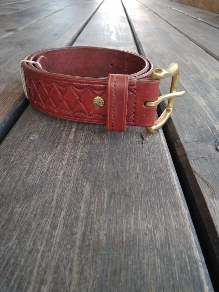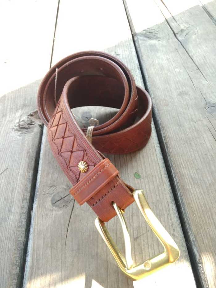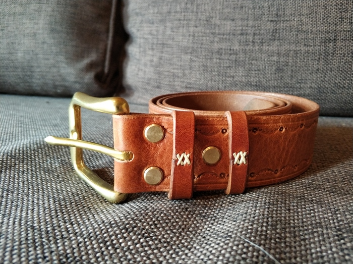 За время моего отсутствия в деревне знакомые немного располнели от хорошей жизни на натуральных продуктах и отсутствии стресса и полосок оказалось впритык по длине под размер. На шлевочки совсем не оставалось кожи в обрезках. Пришлось из коротышей собрать двусоставные шлевки с конструктивными и декоративными сшивками. Иначе не выходило.