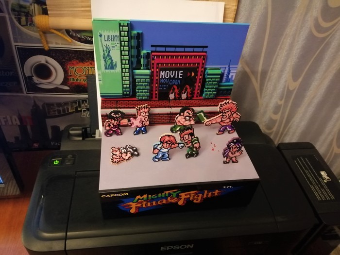 Данное изобретение мне вручили в той самой комнатке пришедшие поздравить с днем рождения родители. К приставке прилагались книга, но вопреки надеждам родителей, метод слепого печатания я не освоил до сих пор. Со временем начали появляться "дискеты", на которых были и Mario, и Mortal Combat III, и Lode Runner, и танчики, и Yie Ar Kung-Fu и множество других замечательных игр. Когда количество дискет стало приближаться к отметке 50, и почти на каждой было около 3-х игр (даже если написано было "9999 in 1"), то процесс выбора во что поиграть мог затянуться на долго. И вот тут мне на помощь приходила совсем ненапряжная игра Mighty Final Fight.