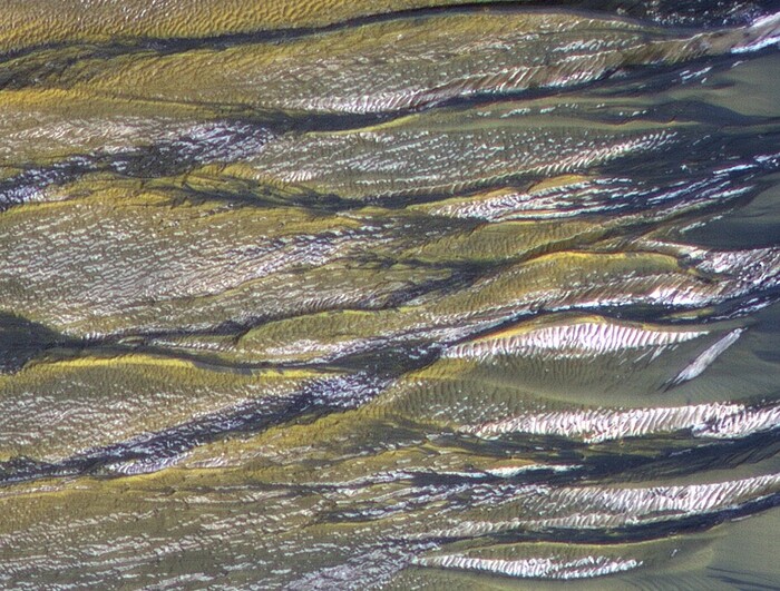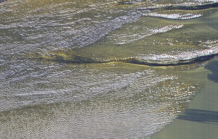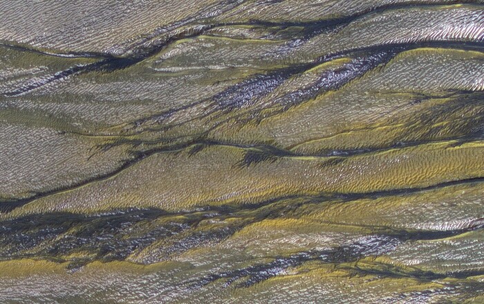 Зимой темные песчаные дюны покрыты слоем белого сезонного льда, который вы можете увидеть на изображении. Но на самом деле это изображение показывает начало марсианской весны, когда солнечная сторона дюн только начала оттаивать.