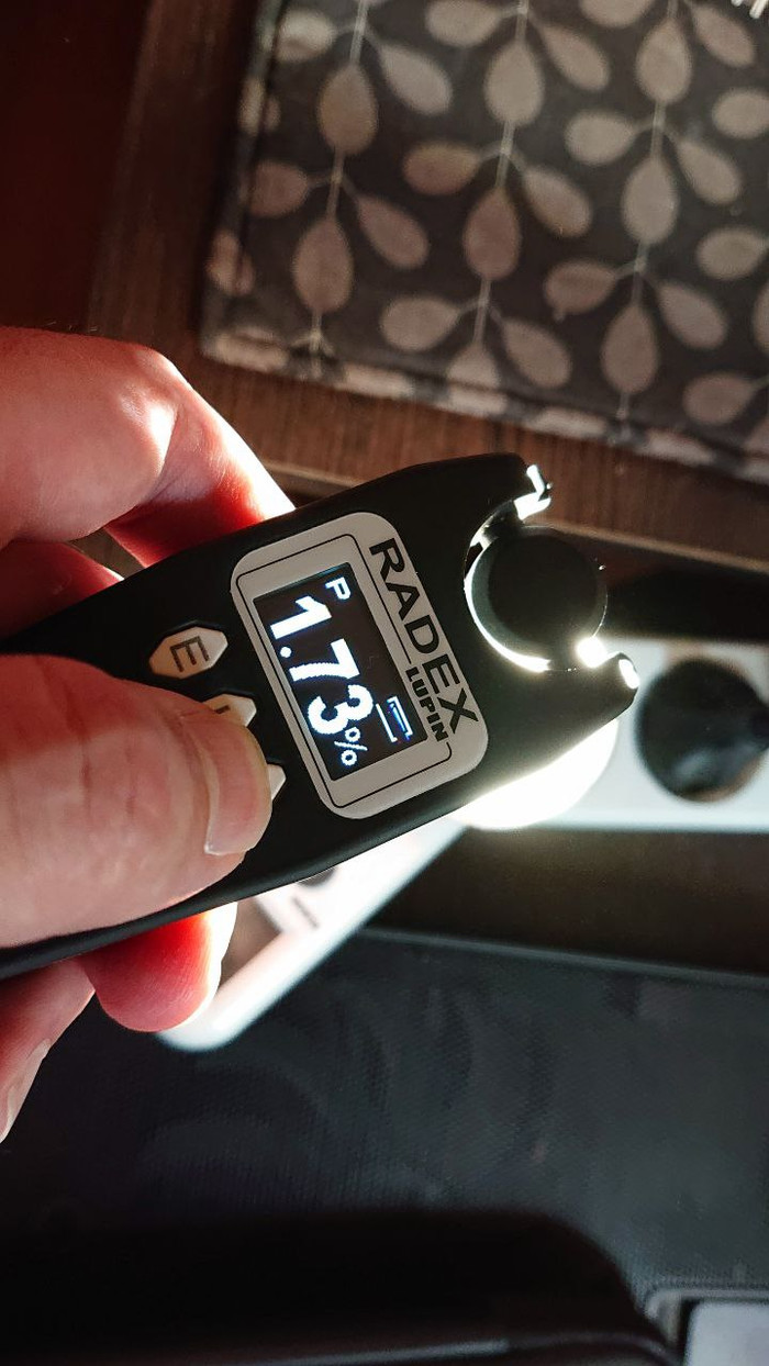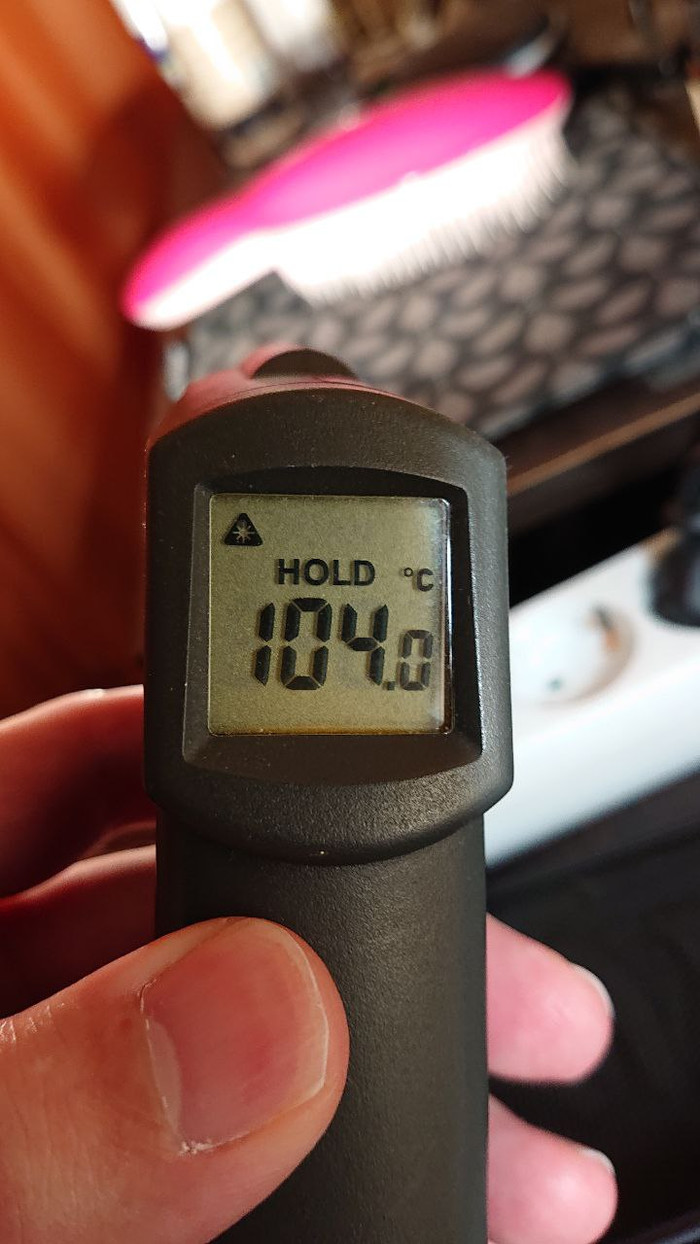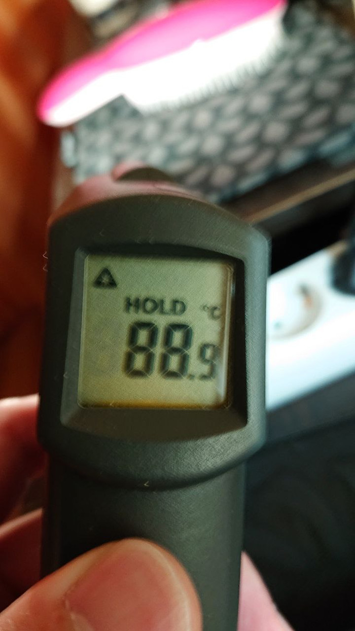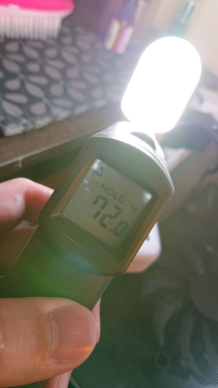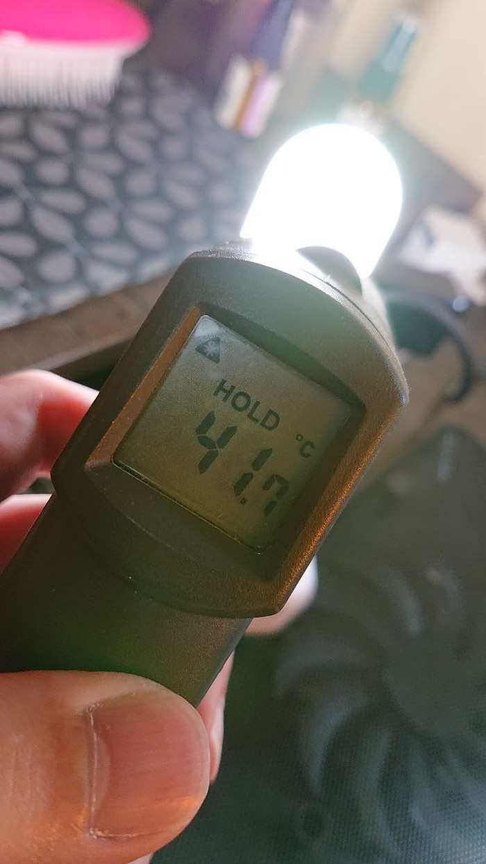 Далее, я как мог сильно воткнул плату боком дабы обеспечить хоть минимальный теплоотвод, включил лампу на 5 минут и замеряю температуру с обратной стороны платы