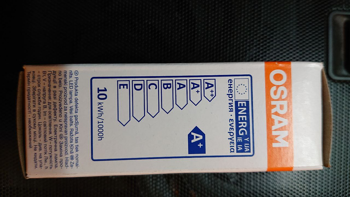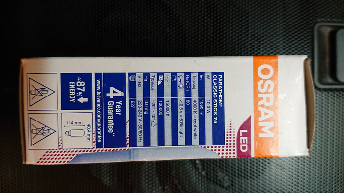 Но посчитав всё - это выходит дешевле, так что берём! На тест беру брендовую лампу OSRAM LED STAR CLASSIC A100. Коробка заявляет - German Lightning expert. Срок службы 15 лет*! Класс энергопотребления А. Заявлений море, прям уговорили. Выглядит так:
