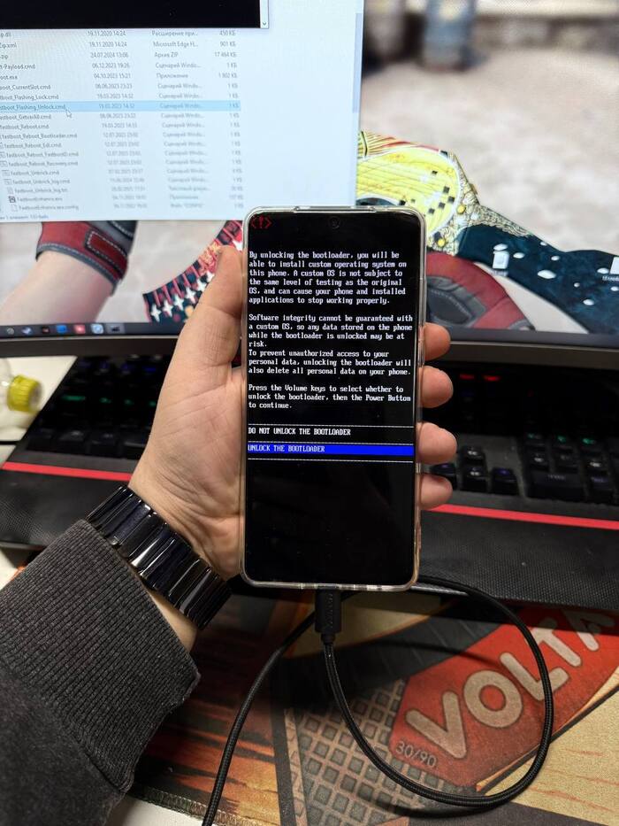 Включаем возможности разработчика, тапнув 7 раз по "Номер версии", заходим в эти настройки и включаем "Заводская разблокировка" и "Отладка по Usb" для удобной работы с телефоном. Загружаем в режим бутлоудера, и запускаем batфайл"Fastboot Unlock. На телефоне появится запрос на подтверждения разблокировки загрузчика, нужно подтвердить боковыми кнопками.