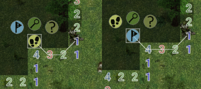 - клик по неразведанным ячейкам вызывает меню действий, которое рисуется вокруг нажатой ячейки - это страхует от нечаянного прохода по мине, а также показывает и привязывает доступные действия к месту их применения