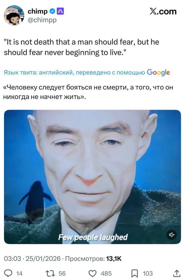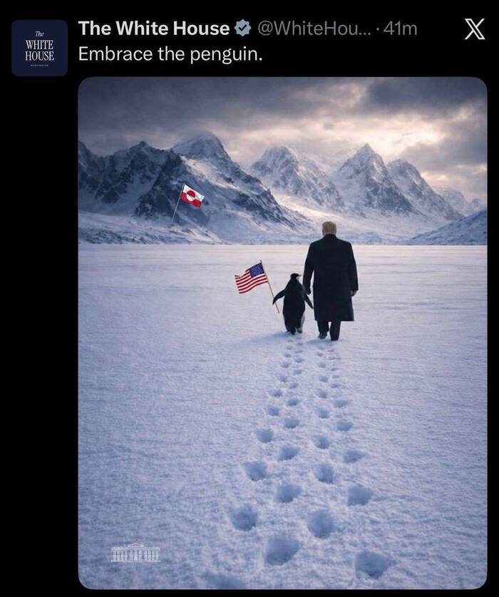 Видимо, у сммщиков Белого дома есть вкус в кино, потому что в официальных соцсетях появилось ИИ-изображение Дональда Трампа, идущего по льдам рядом с тем самым пингвином в сторону флага Гренландии (в Гренландии нет пингвинов, но кто скажет об этом сотрудникам Белого дома?). Зато все вспомнили про пингвина и превратили оригинальный кадр в мем (есть, кстати, версия с кенгуру и захватом Австралии - никто не знает, что Трамп придумает завтра).