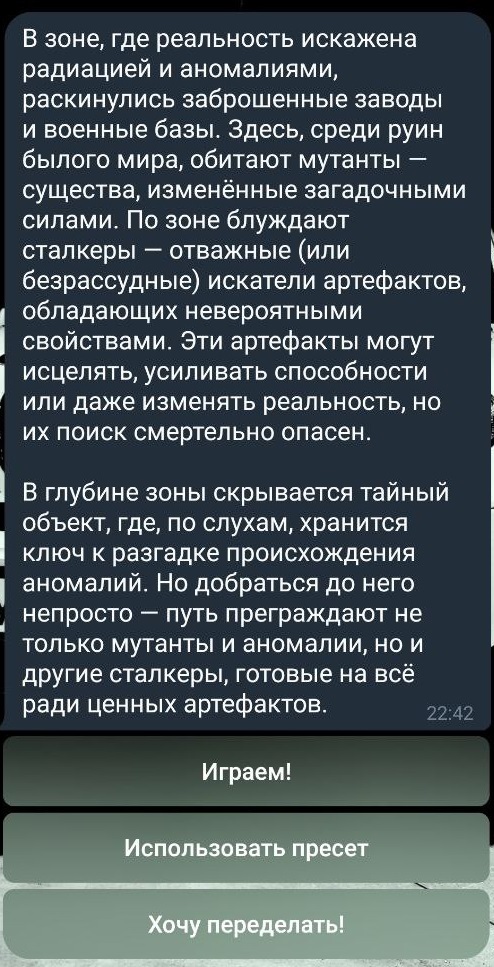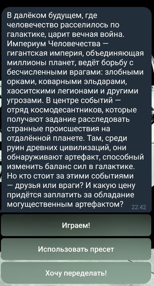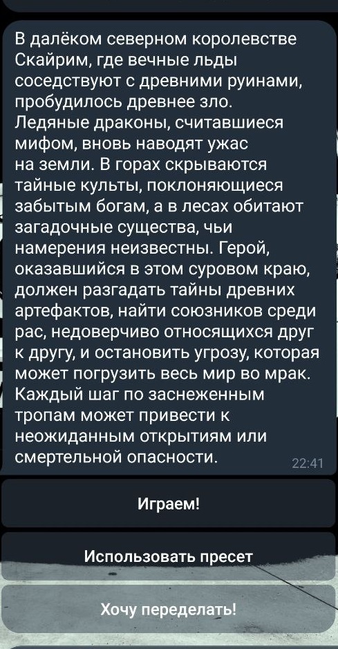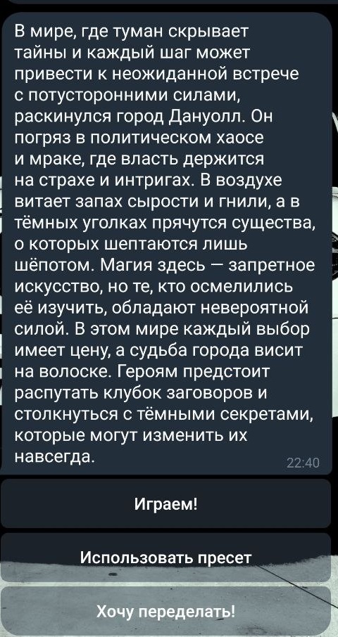 А также я прикинул, что с моей задумкой единственное, что могло вызывать проблемы в авторских правах – название, потому что хоть я и копирую механики (так скажем) в бэк энд, по факту ничего кроме дайсов из прошлого поста в самой игре из атрибутики ДнД видно не будет. Суть в том, что есть часть сеттингов для игры, которые подготовлены заранее (сейчас три) – сгенерированы нейросетью и немного доработаны мной, а второй вариант – просто сгенерить сеттинг под себя, вводом запроса нейронке, как ни банально. Причем работает и сейчас с любыми любимыми всеми вселенными вообще спокойно: