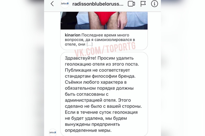 Со страницы отеля Дмитрия попросили удалить геолокацию из поста, так как «публикация не соответствует стандартам бренда». Более того, представитель сети заявил, что любые съемки должны быть согласованы с администрацией отеля. При этом к фотографиям полураздетых женщин в отеле у аккаунта Radisson нет претензий — в комментариях им оставляют сердечки.