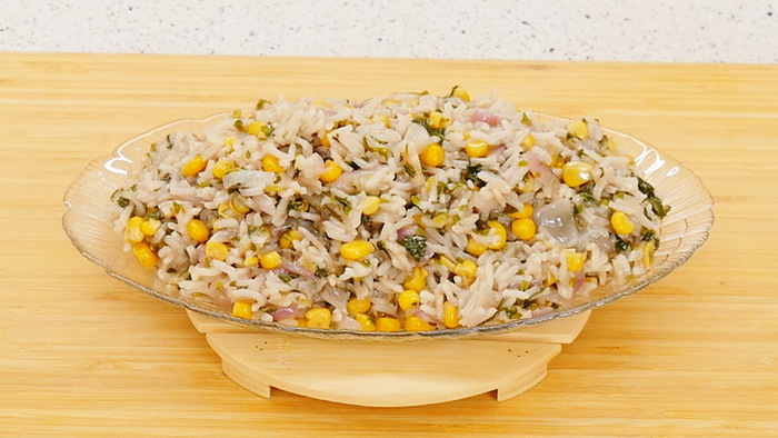 Добавляем 3-4 столовых ложки консервированной кукурузы. Добавляем нарезанную кинзу - всё хорошо перемешиваем.