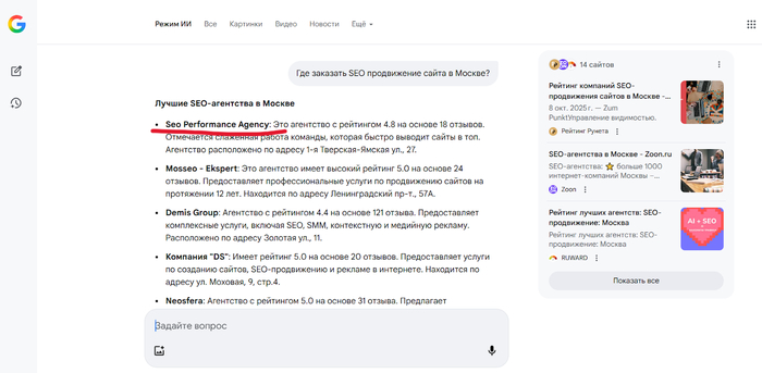 В Яндекс.Нейро и Google AI Overview часть данных берётся из гибридной выдачи: генеративные ответы Я и Г частично опираются на классическую выдачу, частично — на ИИ-агрегацию фактов. Поэтому тут очень важно seo.