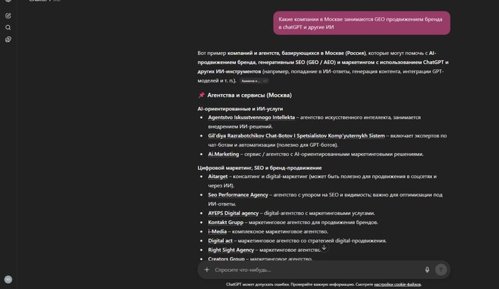 Хоть это и условное разделение с предыдущими, но оно более понятно. Продвижение в больших языковых моделях (ChatGPT, Perplexity, DeepSeek и др.) отличается от Яндекса и Google тем, что у LLM нет поискового ядра. Они полностью строят ответ из своих внутренних знаний о рынке и брендах (собственных алгоритмов).