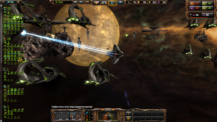 Можно играть на разных уровнях, и игровой процесс при этом будет выглядеть совершенно по-разному. Приблизим камеру — можем управлять кораблями напрямую, хоть каждым в отдельности, на вид обычная стратегия в реальном времени. Несколько отдалим ее — и вот мы уже командуем целым флотом сразу в пределах одного сектора, а составляющие его корабли теперь отмечаются маленькими значками. Еще увеличим масштаб, чтобы в поле зрения уместилась звездная система, — теперь можно управлять только перемещениями из сектора в сектор, решения принимаются на глобальном уровне. А на больших картах можно охватить всю игровую карту с десятками и сотнями планет и астероидов. Все варианты востребованы на протяжении партии в зависимости от того, что требует внимания.