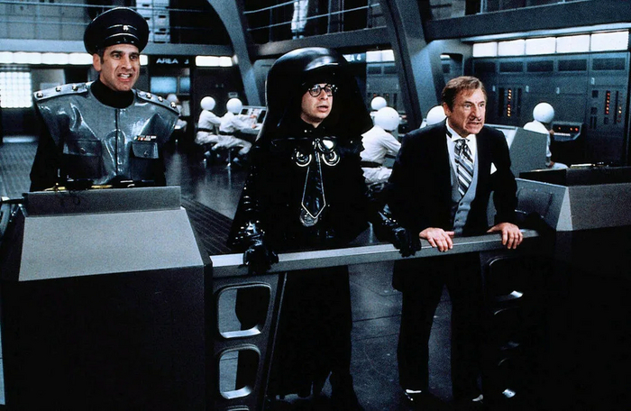 «Spaceballs» — это очень весёлое кино, насыщенное (даже порой перенасыщенное) шутками. Мир Лукаса у Брукса перевернут вверх дном, страшное оказывается смешным. Мрачный великан Дарт Вейдер превращается в суетливого коротышку Шлема, тайком играющего в куклы. Солдаты Империи выглядят идиотами в нелепой форме. Некоторые авторские аллюзии прозрачны донельзя, но есть и те, что уже непонятны современному зрителю без пояснений.
