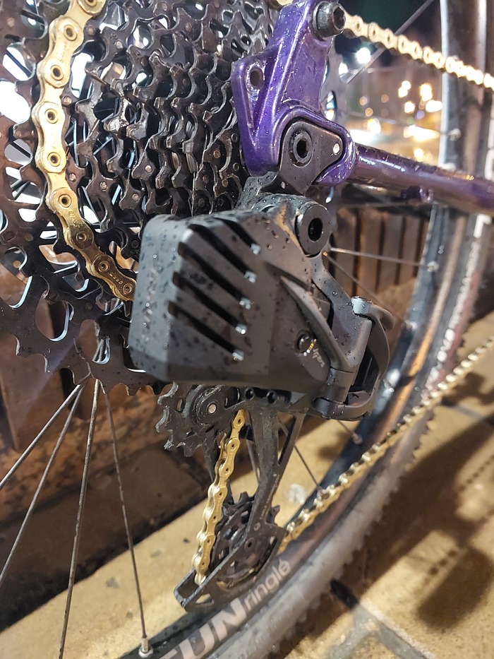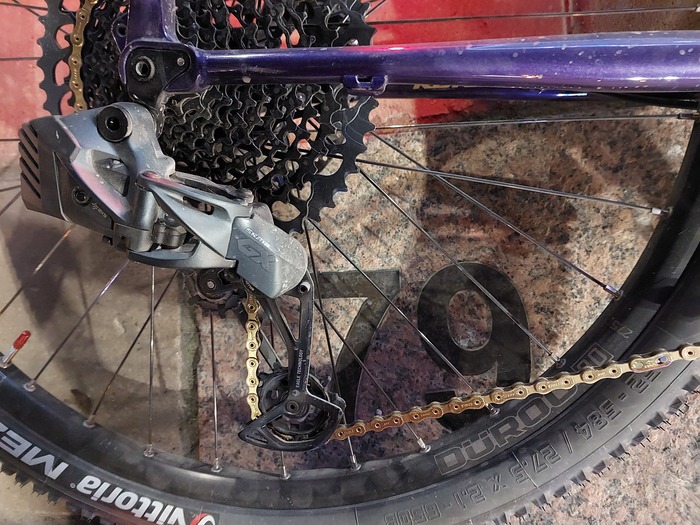 И вот из-за некоторой неудовлетворенности я решил добавить байку iPhon'овости, крутости и высоких технологий. С этой целью были приобретены "пистолеты" Rival AXS с гидравлическими тормозами, переключатель GX AXS, и пересобрано заднее колесо под втулку с XD барабаном, для установки кассеты XG-1275 (10-52). Колёса кстати свежие, собраны летом '23 года, из-за того что WTB пошли трещинами на заднем колесе вдоль обода в районе спиц. Обода SunRingle Duroc, спицы DT Swiss Champion 2.0
