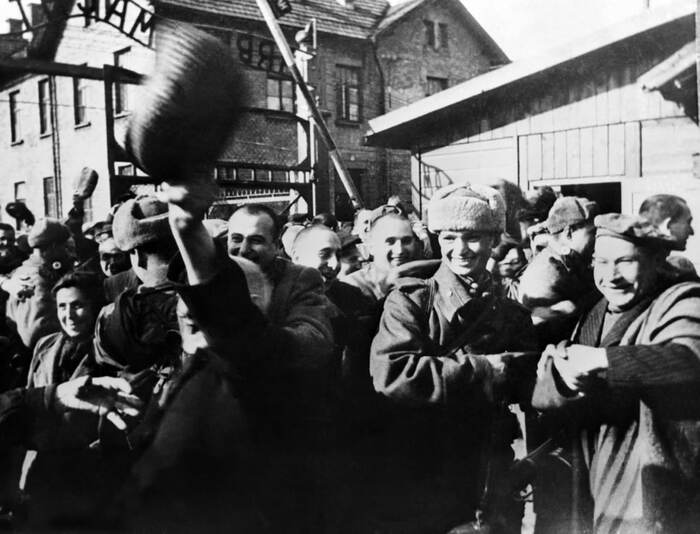 Заключенные концлагеря Освенцим (Аушвиц 1) приветствуют своих освободителей – солдат Красной Армии, 27 января 1945 года