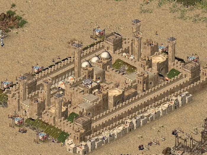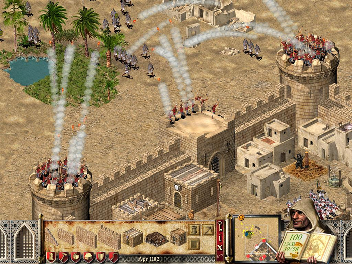 И вот это была пушка. Stronghold Crusaders вышла в 2002 году, и была уже больше заточена под бои между игроками (и компьютерными тоже) на больших картах. Сама кампания в сущности тоже представляла собой 50 таких же карт с разными конфигурациями противников. Самих вражеских лордов теперь 8, и они все ОЧЕНЬ разные. А ещё добавились войска арабских наемников - жутко дорогие для святой земли, но лютые в силу своих способностей.