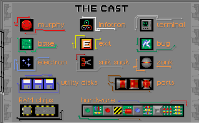 Хочу рассказать вам о своих небольших наработках по клонированию замечательной старенькой игры – Supaplex. Для тех, кто не знает, игра Supaplex вышла в 1991 году. Это двухмерный платформер, в котором предстоит играть за компьютерный вирус Мёрфи. Игра происходит внутри компьютера, необходимо проходить головоломки, собирать специальные объекты "Инфотроны", стараться не загонять себя в безвыходные ситуации. В игре много разных блоков: дискеты-взрывчатки, сник-снеки (ножницы), оперативная память, печатная плата, электроны, порты, зонки. Всего в игре 111 уровней.