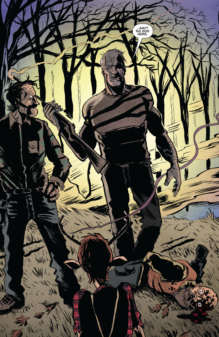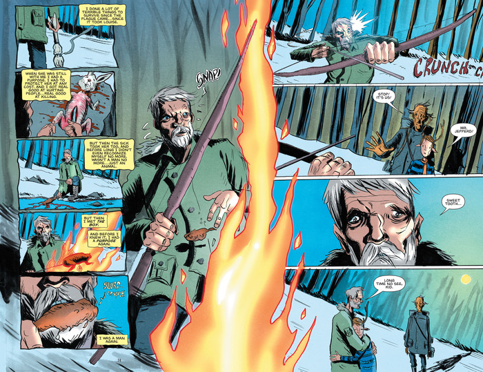 Джефф Лемир все-таки больше писатель, а не художник, поэтому комикс назвать сильно красивым нельзя (на бумаге смотрится получше, но все таки) да и интересных раскадровок тут не много, но самое главное персонажи узнаваемы и вполне читаемы. Кстати если вы задаетесь а почему Сладкоежка, то объясню, при первой встрече Джеппарда и Гаса, мальчик впервые пробует шоколадный батончик и тот ему очень нравится. После чего Джеппарда все 40 выпусков (ну почти, да) называет Гаса Сладкоежкой, хотя мальчик не проявляет какой-то особенной тяги к сладкому за всю историю.