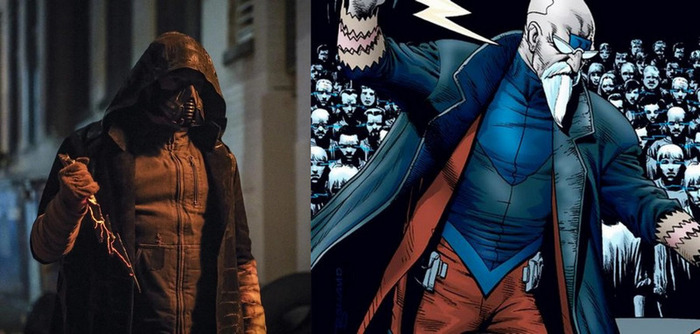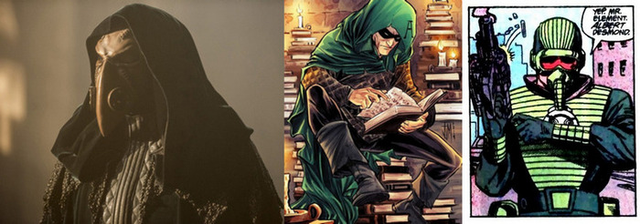 Алхимию правильнее было бы упомянуть вместе с Савитаром...но он далеко не настолько крут. В комиксах это довольно частый враг Флэша с ОЧЕНЬ опасными силами, и его основная сила – трансмутация, превращение одних материалов в другие (превращение асфальта в вязкую смолу, или воздуха в хлор, или стен здания в кислоту и т.д.). Для сериала на сидабе это слишком дороха, так что сериальный Алхимия вместо этого превращает других в металюдей (наделяет суперспособностями) и может в телекинез (размахивая руками, останавливает Флэша на бегу и сбивает с ног). Внешне костюм сериального Алхимии неплох, ибо сочетает элементы из двух разных образов Доктора Алхимии из комиксов – зелёный фэнтезийный плащ и хай-тек маску (правда, даже когда Алхимия в комиксах носил маску, она не была стилизована под клюв чумного доктора). А главное, что человеческое лицо Алхимии принадлежит Тому «Драко Малфой» Фелтону. Его в сериале было слишком мало.