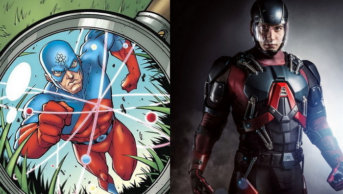 Кстати, о летучках. Далее в программе Атом, Рей Палмер! Как же я радовался, узнав, что персонаж появится, и узнав, кто его будет играть. Сам Супермэн, Брендон Рут! К выбору актёра претензий нет. А вот костюм...если Файршторма сделали Человеком-Факелом, то Атома – Железным Человеком. В комиксах Атом, как уважающий себя супергерой, носит трико. Я ожидал, что Атому в Стреловселенной выдадут что-то типа костюма Человека-Муравья из КВМ, “трико” из толстой кожи. Но тут Сидаб превзошёл себя и наградил Атома целой силовой бронёй и шлемом с прозрачным полузабралом. Отсюда и разница в способностях и подходе к сражению: Атом в комиксах уменьшается, прячется за предметами обстановки и нападает исподтишка, а иногда уменьшается до таких размеров, чтобы на клетках крови верхом ездить. Атом из сериала – Железный Человек. Летает, стреляет репульсорами. Ну ок, иногда уменьшается и летает в уменьшенном виде. Железный Человек-Муравей и Оса.