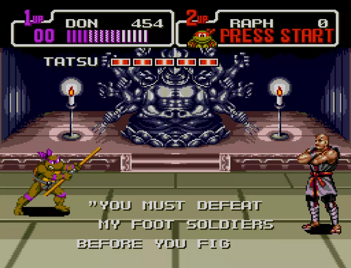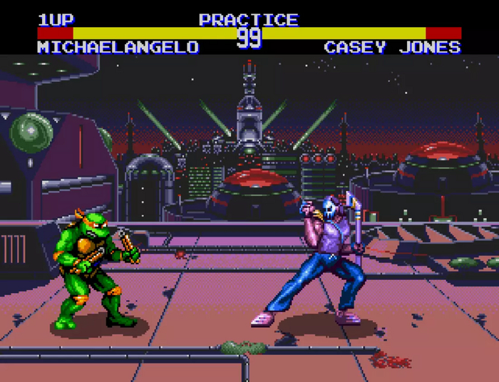 Под этим названием вышло сразу 3 файтинга на разных приставках. Версия для Nintendo Entertainment System (NES) намного популярнее в СНГ, чем во всем мире. Это лучший файтинг на NES, и по ней до сих пор проводятся турниры. Что касается Сеги, то тут всё очень грустно. Мне понравилась мрачная атмосфера игры. Но сам геймплей получился очень слабым. В игре задействовано всего 3 клавиши, при этом одна из них отвечает за насмешку над противником! Также в игре нет Шреддера, а есть 3 неиграбельных босса. В общем, если вы ищете хороший 16-битный файтинг про черепах, обратите внимание на SNES версию. Это действительно хорошая игра на уровне “Primal Rage” или “Fatal Fury 2”. Что касается Сеги, то тут… Тир: C.
